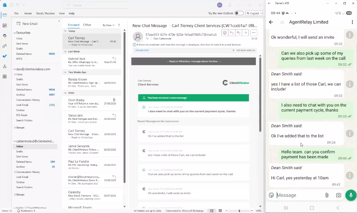 ClientWindow automatically integrates messaging app conversations on WhatsApp and other chat platforms with your internal communication software, including email, Teams and Slack.